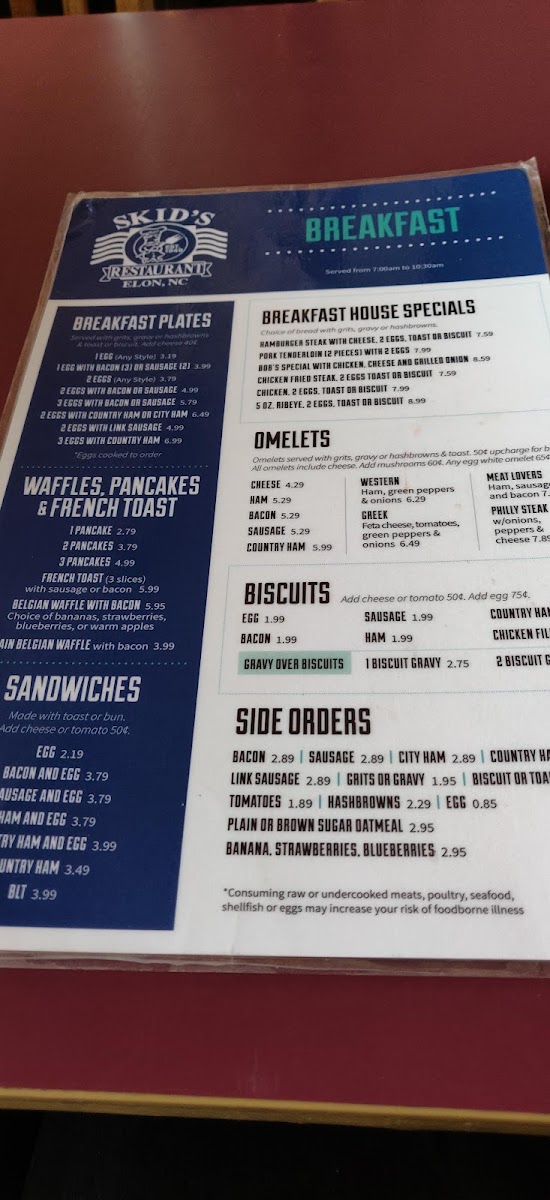 Welcome to Skid's Restaurant of Elon, a delightful eatery located at 134 W Haggard Ave, Elon, NC. This charming restaurant specializes in home-style cooking that warms the heart. Their breakfast menu is a standout, featuring Bob's Special—a mouthwatering combination of chicken, cheese, and grilled onions, served alongside grits or hash browns for just $12.95. Another highlight is the Ribeye Steak & Eggs, a sumptuous way to kickstart your day.